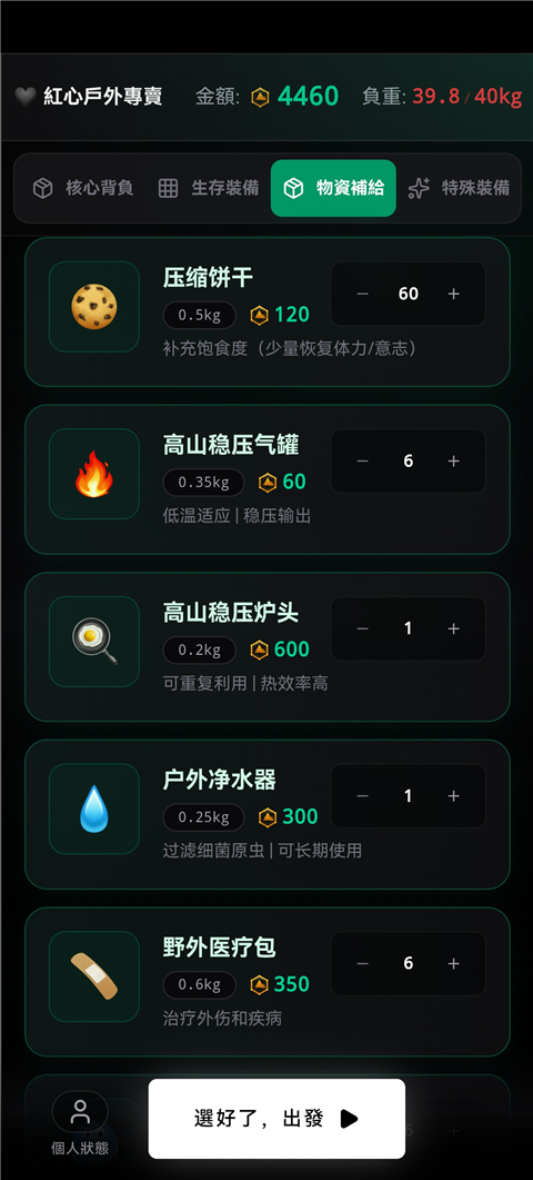5.到达每个补给站可补充物资,但需权衡负重与预算是否充足。