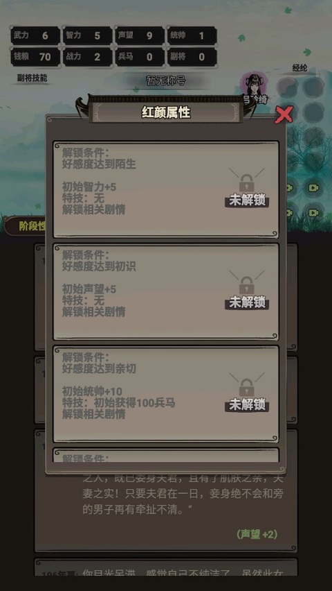 4) 注意角色属性变化,如智力、武力等,它们会影响可用选项。