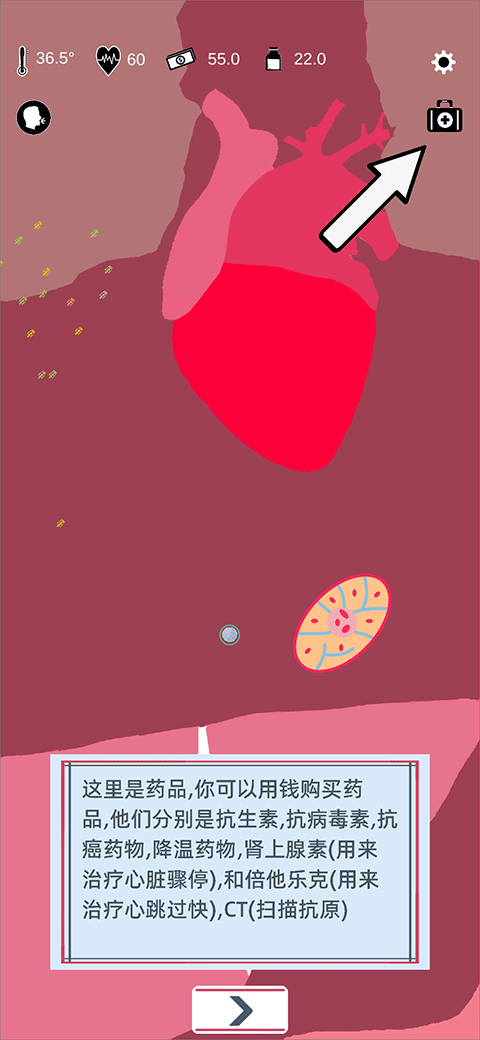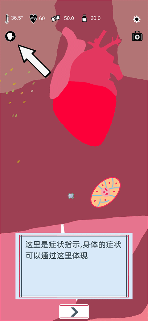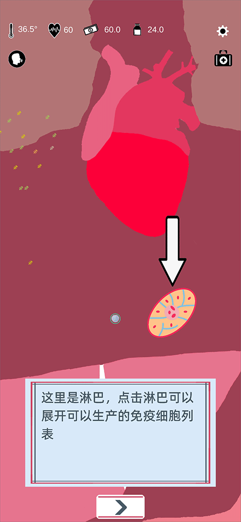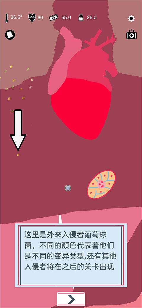 1、进入游戏后选择关卡,了解当前病毒类型与目标器官的防御需求。