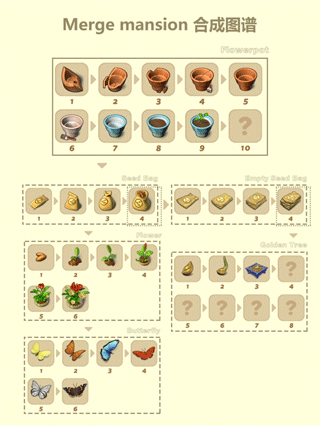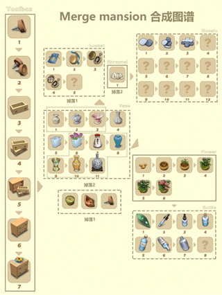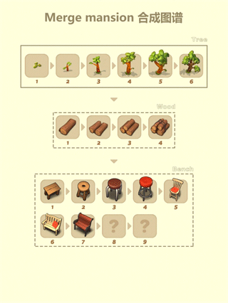 1. 核心循环是收集基础物品,两两合并为更高阶家具。