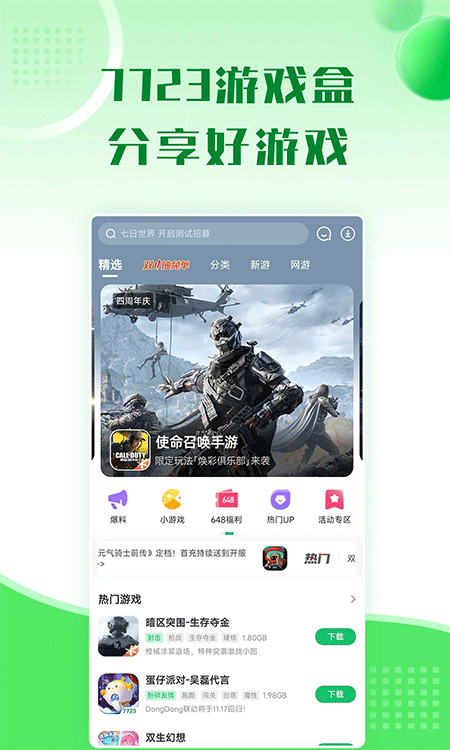 7723游戏盒app是一款专为游戏玩家打造的多功能游戏软件,不仅汇集了海量游戏资源,还提供丰富的礼包与折扣码,同时内置聊天交友功能,帮助玩家轻松找到队友开黑,享受竞技乐趣。