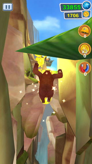 1) 玩家控制熊大在森林赛道中持续奔跑,通过滑动屏幕躲避障碍物并收集金币。