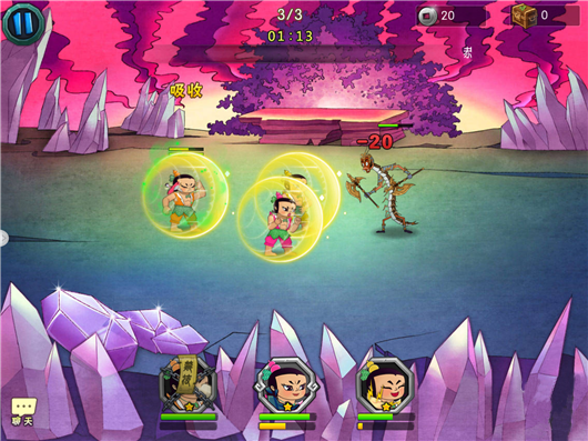 2. 左下方摇杆控制角色移动,右下方技能按钮释放对应葫芦娃绝招。