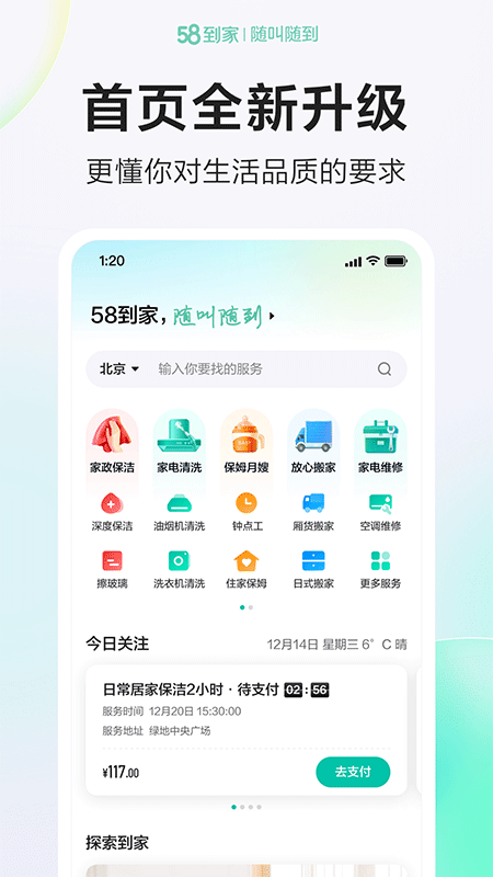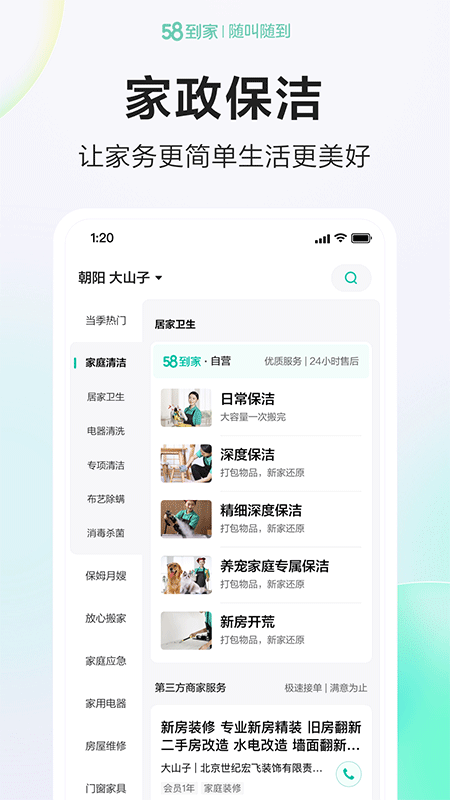 58到家app是一款专注于高品质生活服务的综合平台,覆盖保洁清洗、家电清洗、钟点工、搬家、家电维修、看护小孩、照顾老人、开锁换锁、数码维修、教育培训、批发采购等多元领域,基本能一站式满足用户的日常所需,切实解决生活中的各类小麻烦。