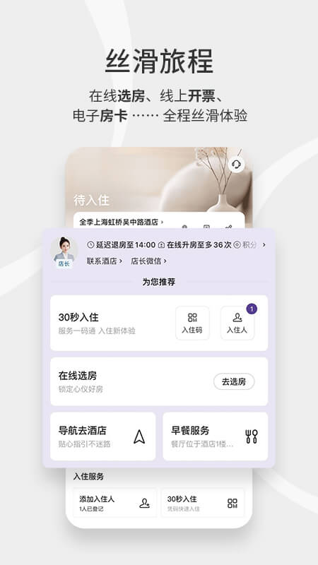 4.提供延迟退房、在线选房、自助入住等便捷服务。