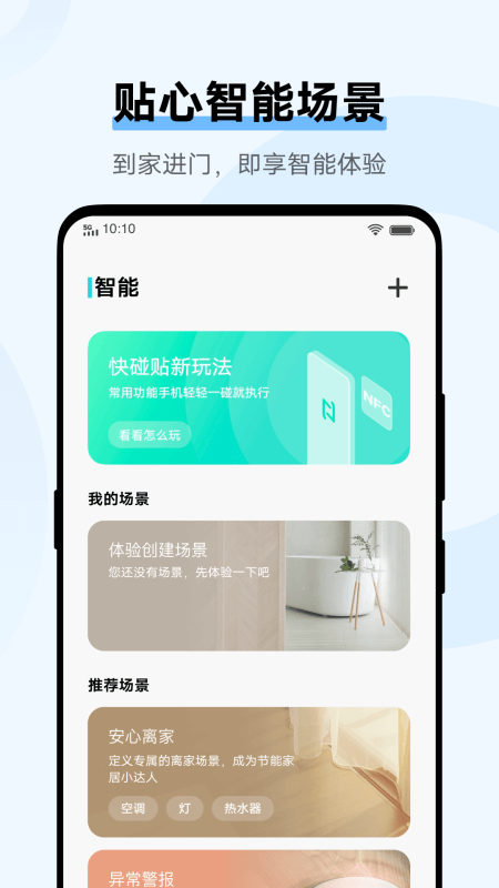 3. 进入“场景”页面新建智能场景,设置如“离家模式”一键关闭全部家电。