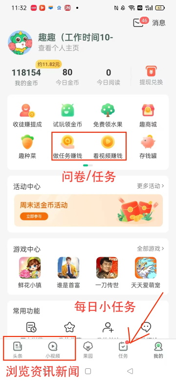 2) 视频模块:集成短视频与直播内容,观看即可获得金币奖励,边看边赚。