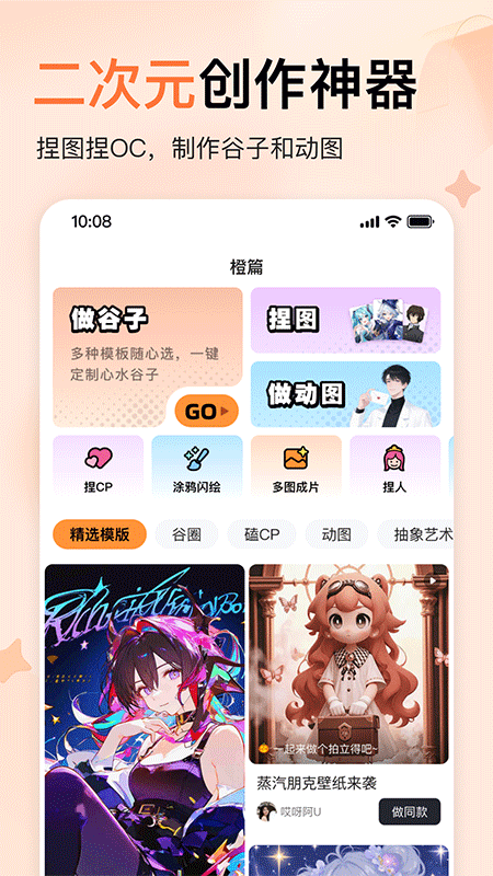 1.提供海量二次元模板,一键生成壁纸、头像、梗图等创意内容。