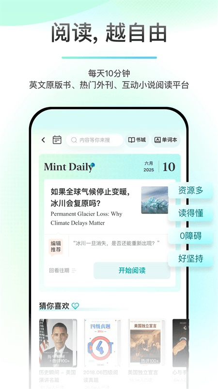 薄荷阅读app真正做到了“因材施教”,从智能推荐到专业工具都围绕用户的实际水平设计,避免了盲目阅读的痛点。海量正版资源搭配科学阅读计划,让英语学习变得自然且可持续。虽然部分高阶书籍需要付费解锁,但整体体验流畅、功能实用,尤其适合想通过阅读提升综合英语能力的学习者。如果你正在寻找一款能真正陪你读懂英文原版书的工具,它值得尝试。