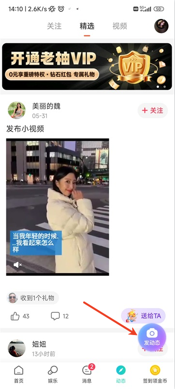 5. 在“动态”页面点击“+”按钮,选择图片或视频发布。