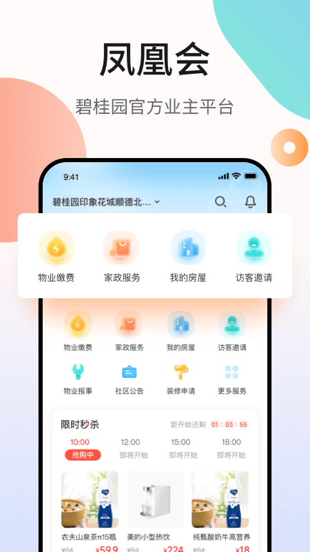 凤凰会app是碧桂园为业主量身打造的一站式生活服务管家,整合地产、金融、物业、酒店与家装等多元板块,全方位满足居住需求。注册会员即可独享碧桂园旗下专属优惠,平台更依据个人偏好推送定制化活动与服务,让每位用户都能获得贴心、便捷的社区生活体验。