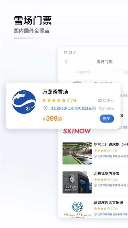 2.提供全国主要滑雪场的比价与在线购票功能,省钱省心。