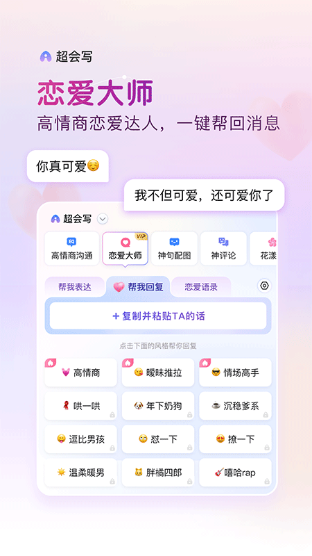 3) 提供多个短语分类,一键调用常用语句,聊天回复更快捷。